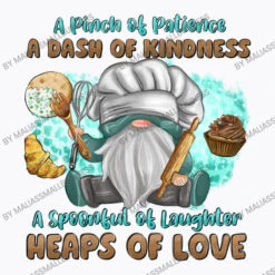 Digital printing is an amazing process that involves your artwork “A Pinch Of Patience A Das Of Kindness” being processed by a computer and then printed directly onto the surface of your product. Digital printing is not a heat transfer or applique, as the ink directly adheres to the fabric of your shirt. Each printing process has its strengths, and our artwork team will weigh these when deciding which to use for your art.