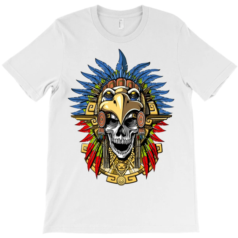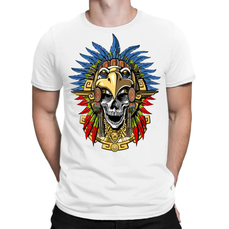 Digital printing is an amazing process that involves your artwork “Aztec Skull Eagle Warrior Mask” being processed by a computer and then printed directly onto the surface of your product. Digital printing is not a heat transfer or applique, as the ink directly adheres to the fabric of your shirt. Each printing process has its strengths, and our artwork team will weigh these when deciding which to use for your art.