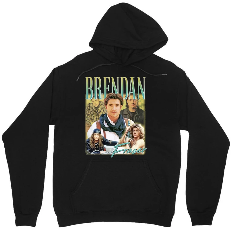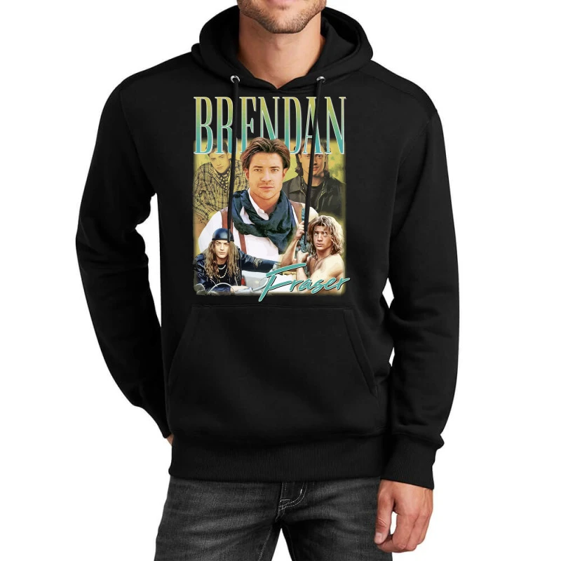 Plot Printing Consists of both Flock and Flex Print, This process transfers your artwork “Brendan Fraser” from a special foil through an immense amount of pressure and heat. Flex images are smooth, a little plastic like and a tad bit glossy. Flock images have a fuzzy velvet-like texture and appear slightly more elevated. Think of drawing just the shadows and how that would appear without color. 3 colors plus the color of the garment itself is used to print.