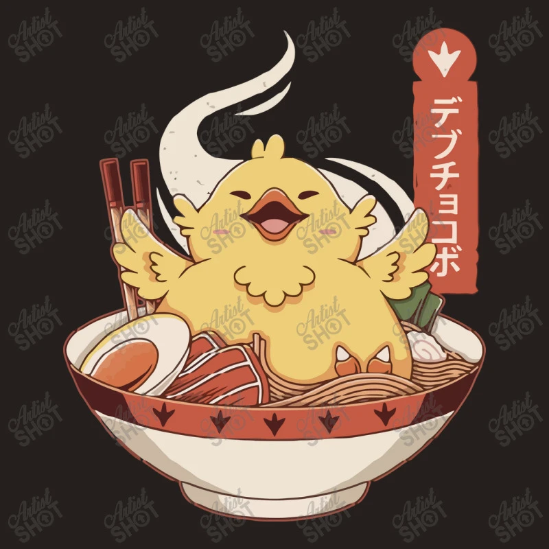 Digital printing is an amazing process that involves your artwork “Chocobo Ramen” being processed by a computer and then printed directly onto the surface of your product. Digital printing is not a heat transfer or applique, as the ink directly adheres to the fabric of your shirt. Each printing process has its strengths, and our artwork team will weigh these when deciding which to use for your art.