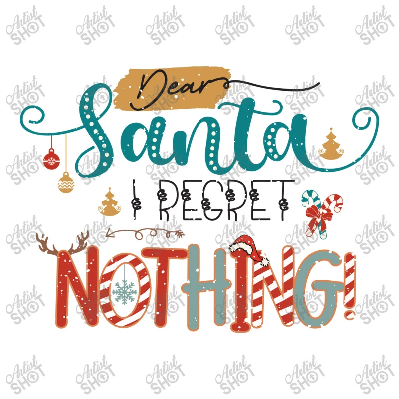 Digital printing is an amazing process that involves your artwork “Dear Santa I Regret Nothing! Svg” being processed by a computer and then printed directly onto the surface of your product. Digital printing is not a heat transfer or applique, as the ink directly adheres to the fabric of your shirt. Each printing process has its strengths, and our artwork team will weigh these when deciding which to use for your art.