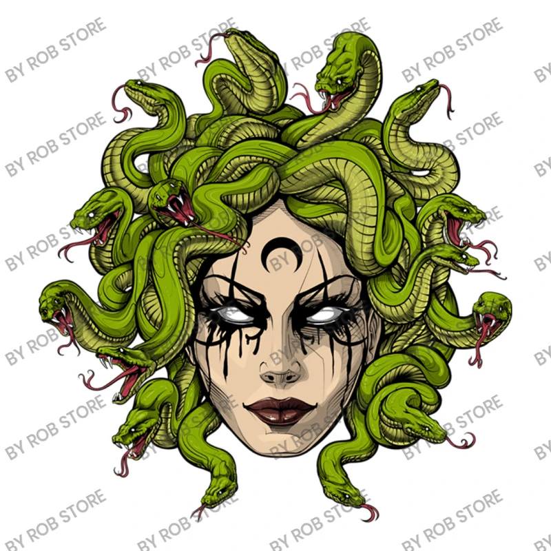 Digital printing is an amazing process that involves your artwork “Greek Goddess Medusa” being processed by a computer and then printed directly onto the surface of your product. Digital printing is not a heat transfer or applique, as the ink directly adheres to the fabric of your shirt. Each printing process has its strengths, and our artwork team will weigh these when deciding which to use for your art.