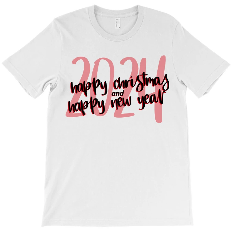 Digital printing is an amazing process that involves your artwork “Happy Christmas And Happy New Year 2024” being processed by a computer and then printed directly onto the surface of your product. Digital printing is not a heat transfer or applique, as the ink directly adheres to the fabric of your shirt. Each printing process has its strengths, and our artwork team will weigh these when deciding which to use for your art.