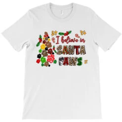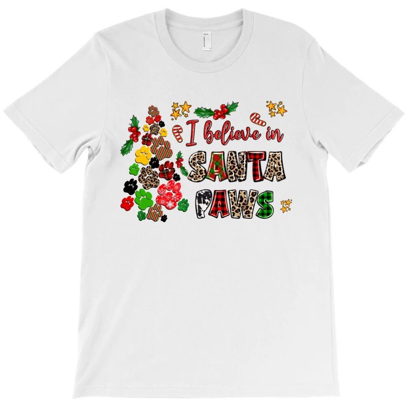 Digital printing is an amazing process that involves your artwork “I Believe In Santa Paws” being processed by a computer and then printed directly onto the surface of your product. Digital printing is not a heat transfer or applique, as the ink directly adheres to the fabric of your shirt. Each printing process has its strengths, and our artwork team will weigh these when deciding which to use for your art.