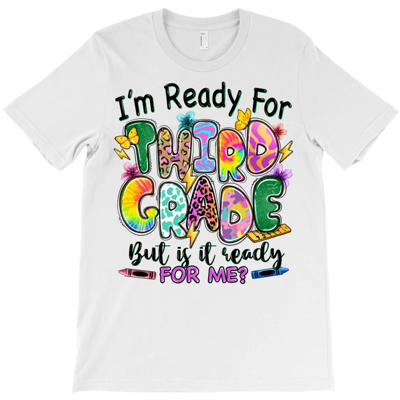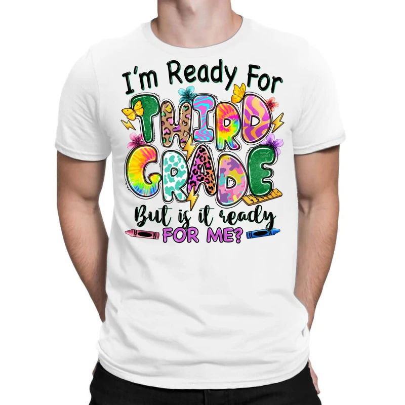 Digital printing is an amazing process that involves your artwork “I’m Ready For Third Grade But Is It Ready For Me” being processed by a computer and then printed directly onto the surface of your product. Digital printing is not a heat transfer or applique, as the ink directly adheres to the fabric of your shirt. Each printing process has its strengths, and our artwork team will weigh these when deciding which to use for your art.