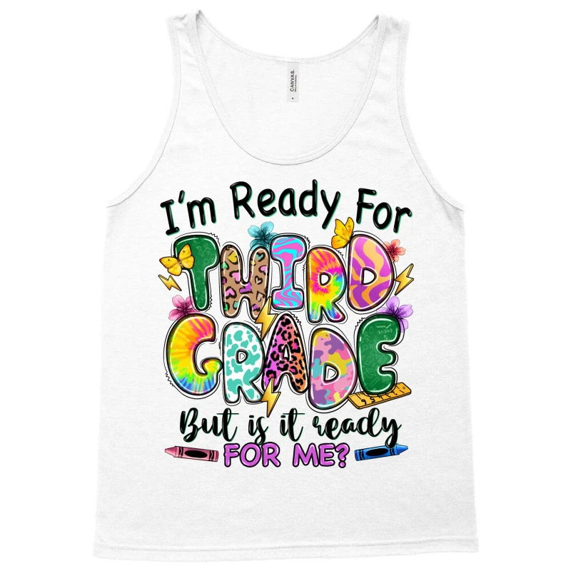 Digital printing is an amazing process that involves your artwork “I’m Ready For Third Grade But Is It Ready For Me” being processed by a computer and then printed directly onto the surface of your product. Digital printing is not a heat transfer or applique, as the ink directly adheres to the fabric of your shirt. Each printing process has its strengths, and our artwork team will weigh these when deciding which to use for your art.