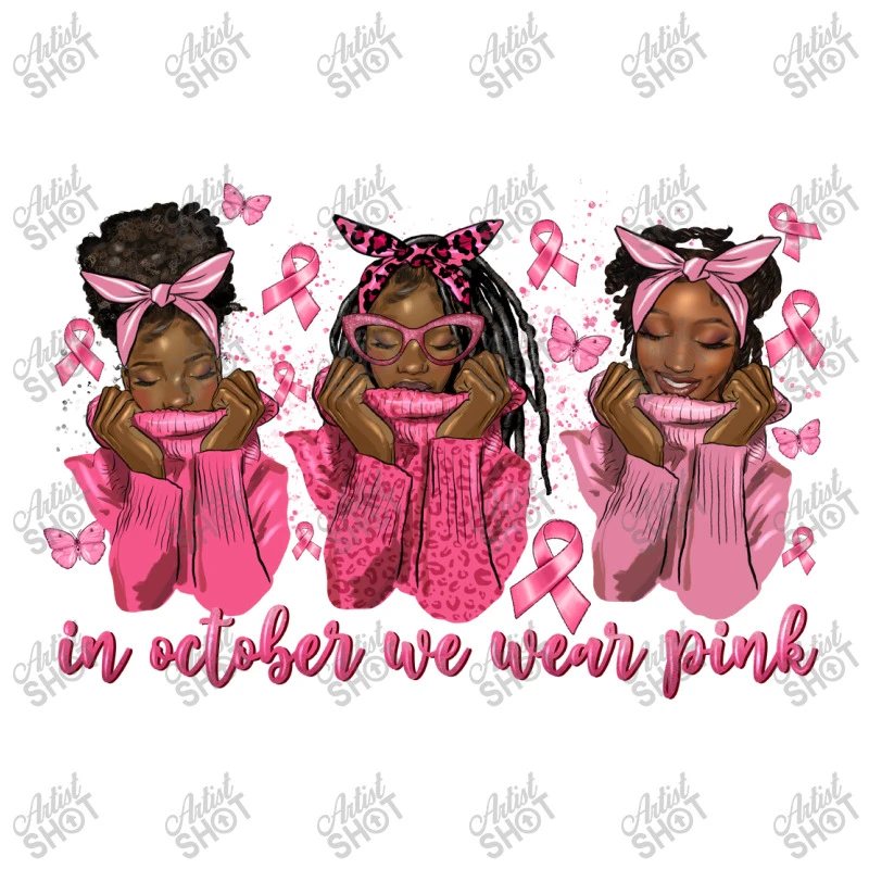Digital printing is an amazing process that involves your artwork “In October We Wear Pink 3 Afro Woman Breast Cance” being processed by a computer and then printed directly onto the surface of your product. Digital printing is not a heat transfer or applique, as the ink directly adheres to the fabric of your shirt. Each printing process has its strengths, and our artwork team will weigh these when deciding which to use for your art.