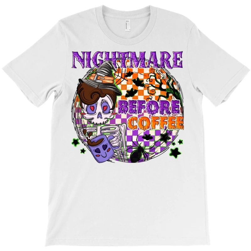 Digital printing is an amazing process that involves your artwork “Nightmare Before The Coffee Halloween” being processed by a computer and then printed directly onto the surface of your product. Digital printing is not a heat transfer or applique, as the ink directly adheres to the fabric of your shirt. Each printing process has its strengths, and our artwork team will weigh these when deciding which to use for your art.