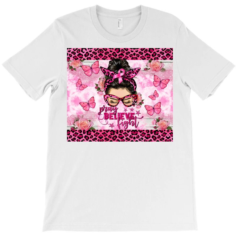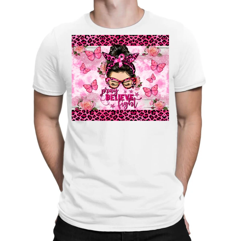 Digital printing is an amazing process that involves your artwork “Pray Believe Fight Breast Cancer Messy Bun” being processed by a computer and then printed directly onto the surface of your product. Digital printing is not a heat transfer or applique, as the ink directly adheres to the fabric of your shirt. Each printing process has its strengths, and our artwork team will weigh these when deciding which to use for your art.