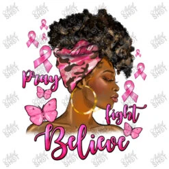 Digital printing is an amazing process that involves your artwork “Pray Fight Believe Afro Woman Breast Cancer” being processed by a computer and then printed directly onto the surface of your product. Digital printing is not a heat transfer or applique, as the ink directly adheres to the fabric of your shirt. Each printing process has its strengths, and our artwork team will weigh these when deciding which to use for your art.