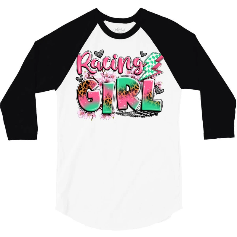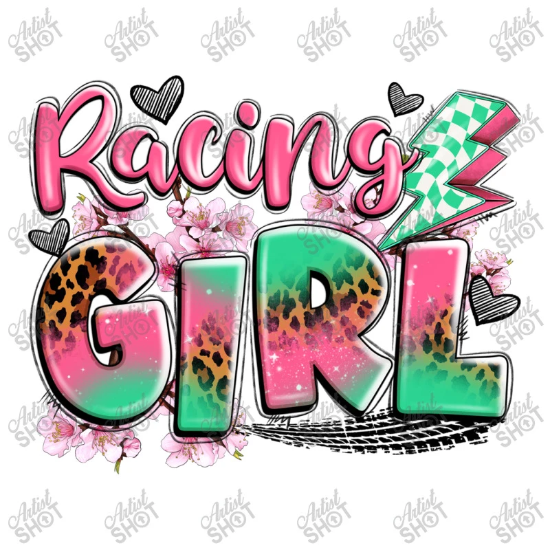 Digital printing is an amazing process that involves your artwork “Racing Girl” being processed by a computer and then printed directly onto the surface of your product. Digital printing is not a heat transfer or applique, as the ink directly adheres to the fabric of your shirt. Each printing process has its strengths, and our artwork team will weigh these when deciding which to use for your art.