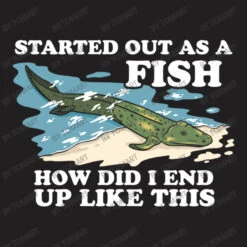 Digital printing is an amazing process that involves your artwork “Started Out As A Fish How Did I End Up Like This” being processed by a computer and then printed directly onto the surface of your product. Digital printing is not a heat transfer or applique, as the ink directly adheres to the fabric of your shirt. Each printing process has its strengths, and our artwork team will weigh these when deciding which to use for your art.
