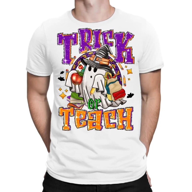 Digital printing is an amazing process that involves your artwork “Trick Or Teach Halloween” being processed by a computer and then printed directly onto the surface of your product. Digital printing is not a heat transfer or applique, as the ink directly adheres to the fabric of your shirt. Each printing process has its strengths, and our artwork team will weigh these when deciding which to use for your art.